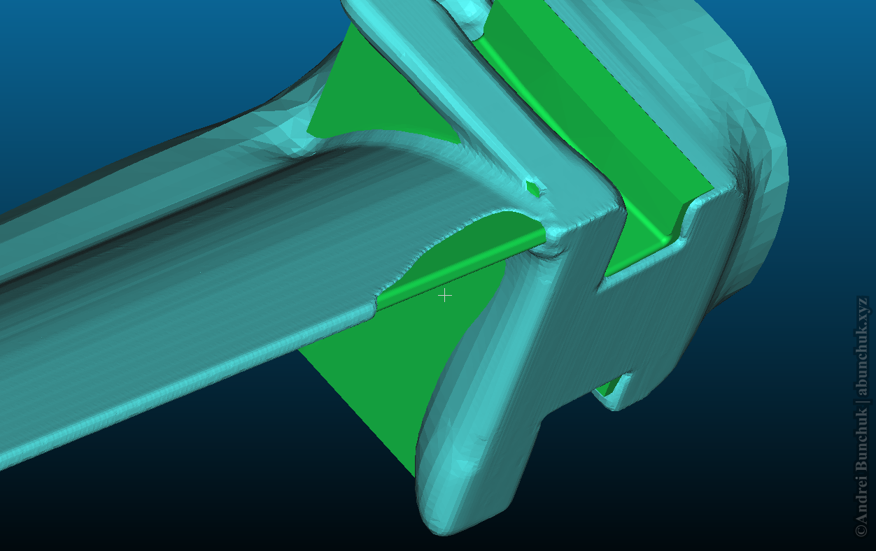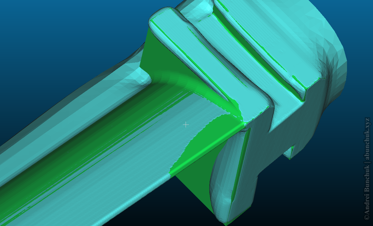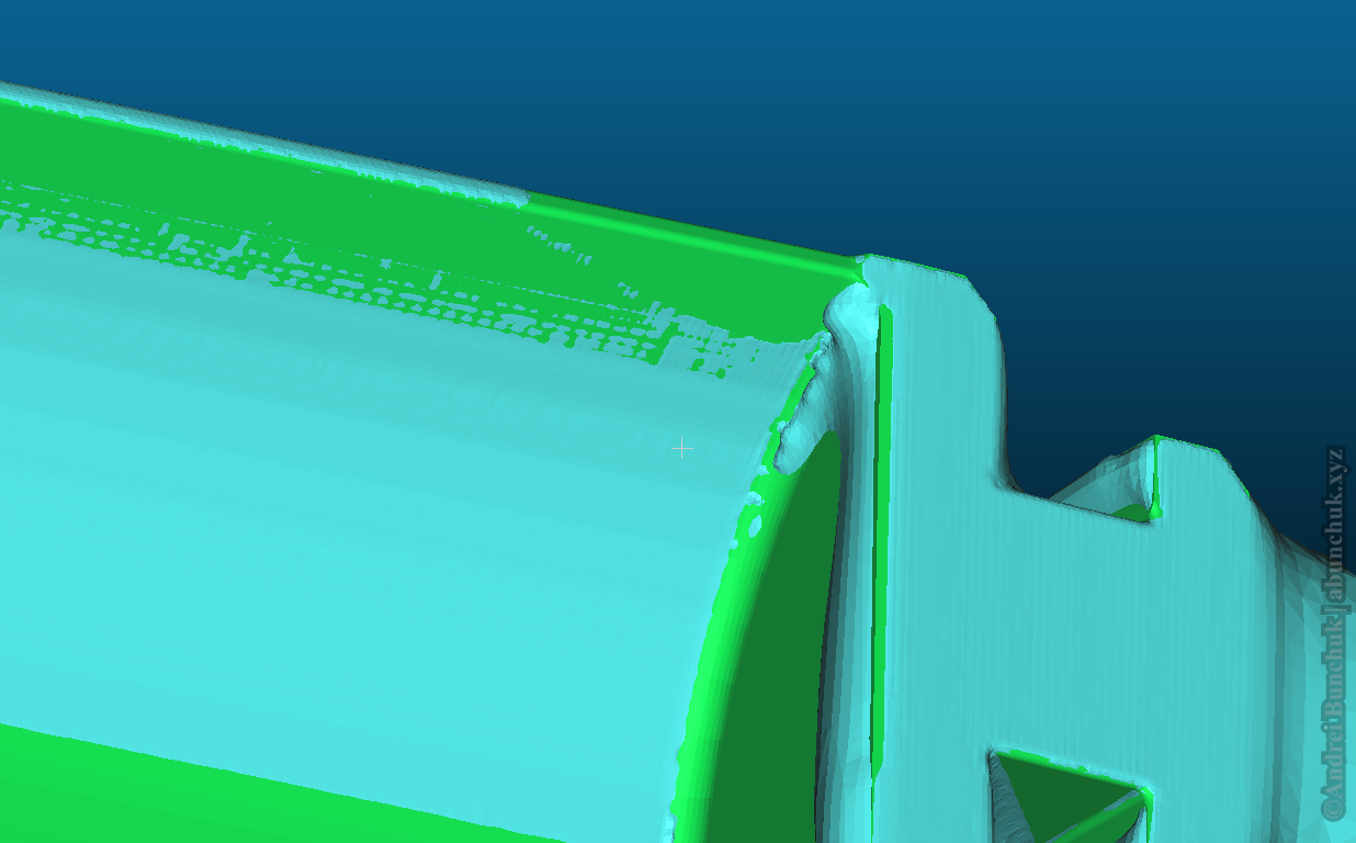 At the previous stage, the surface of the filling area was obtained, which reflects the deviation of the scanned part from the reference 3D model.