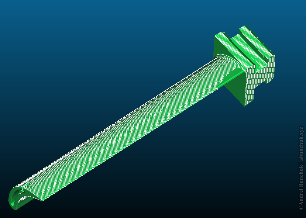 The filling example uses traditional filling approaches used in 3D printers. In this case, filling always occurs from the bottom up. Therefore, it is necessary to orient the filling area at the bottom with the side that is adjacent to the surface of the blade.
