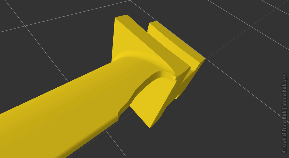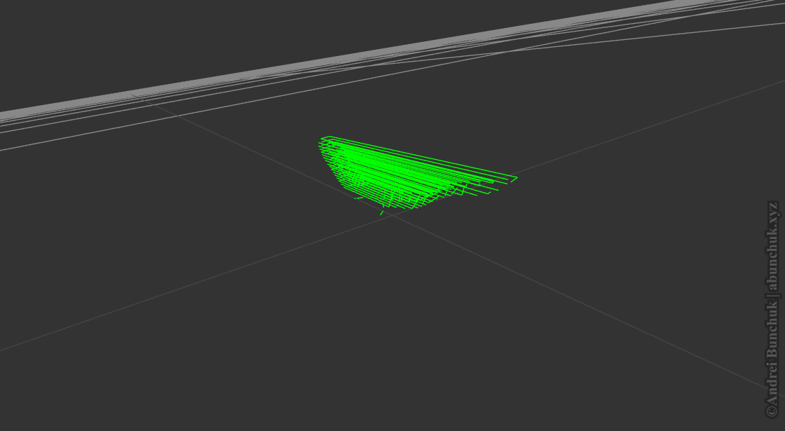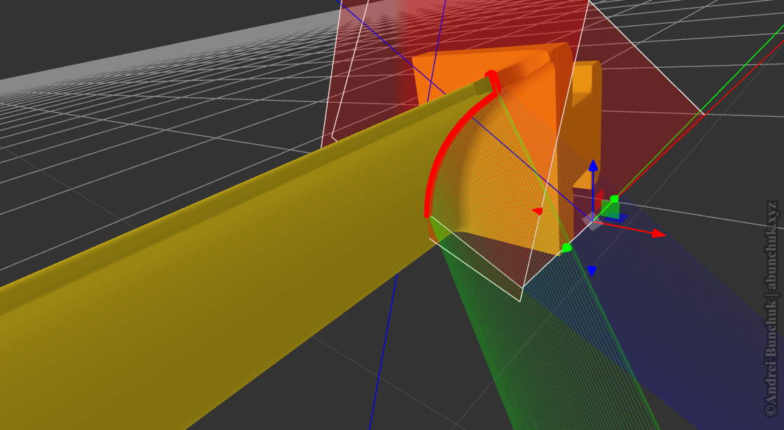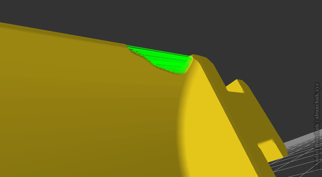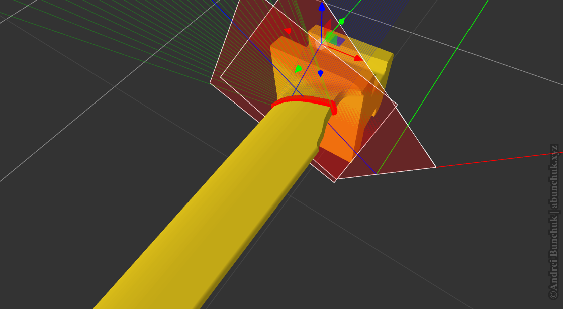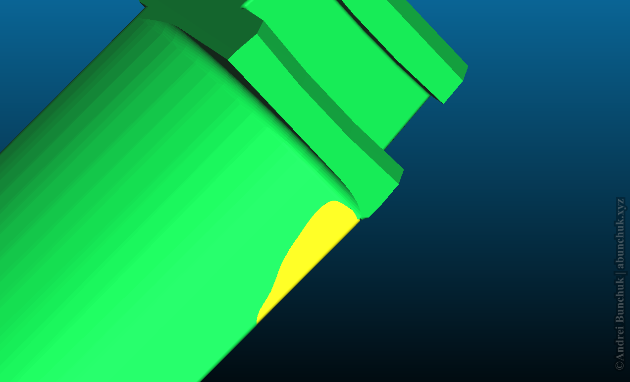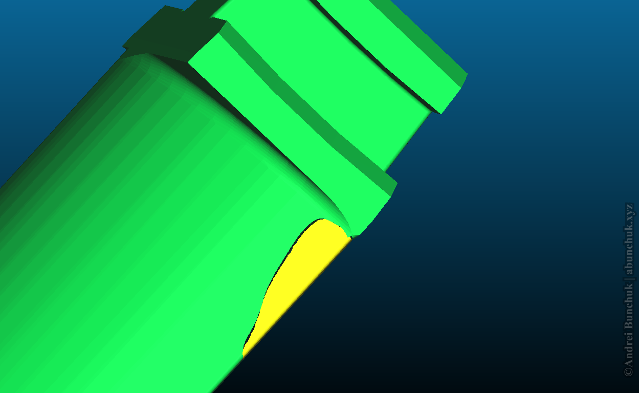 To solve this problem, various approaches can be used. For example, constructing perpendiculars at the defect location from the upper surface to the intersection with the bottom surface of the reference 3D model. For simplicity, the model with the defect will be slightly upscaled for better display of the defect boundaries (x1.05-x1.07). As a result, a more obvious boundary is formed at the top: