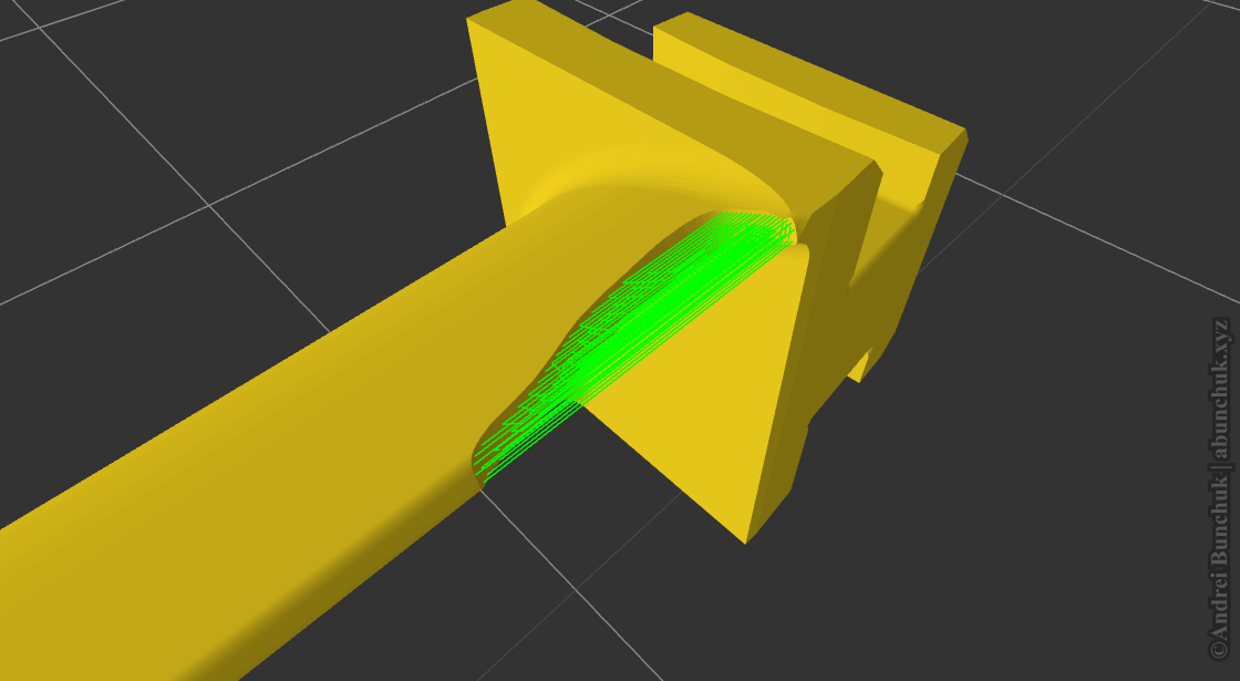 It is also necessary to determine the direction of the orientation angles of the surfacing tool. The average direction of the blade bending can be taken as the main direction. It is also necessary to take into account the features of the equipment used. Thus, determining the angles of the orientation direction of the tool at each point of the trajectory will be a set of heuristics based on the characteristics of the equipment.
