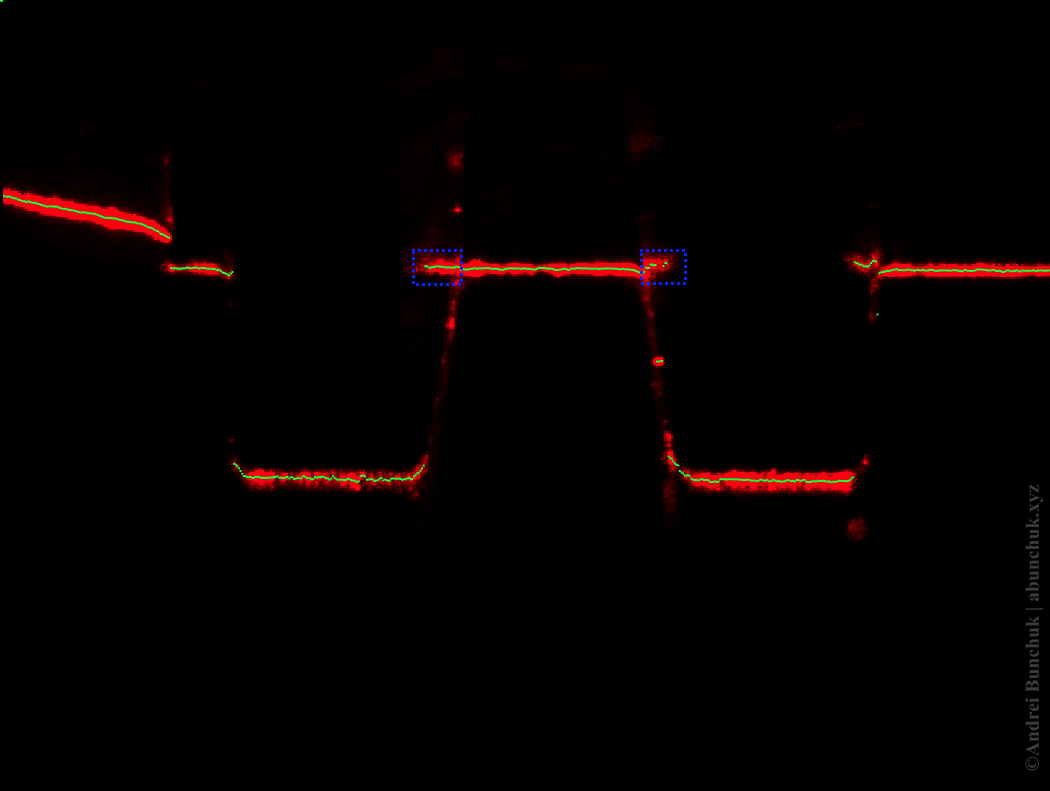 One solution to this problem may be to detect the peak not of maximum intensity, but the last one in the image column. It is clear that there are now no detected points in the reflection area, but they are present on the side surfaces.